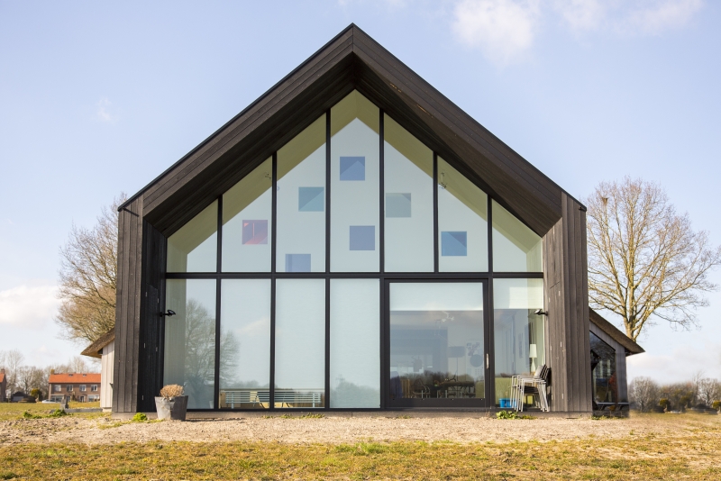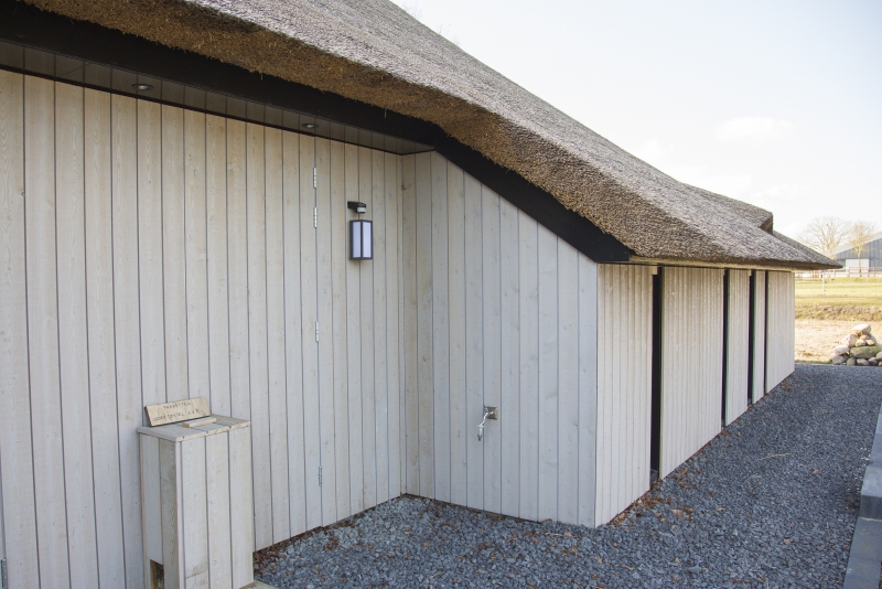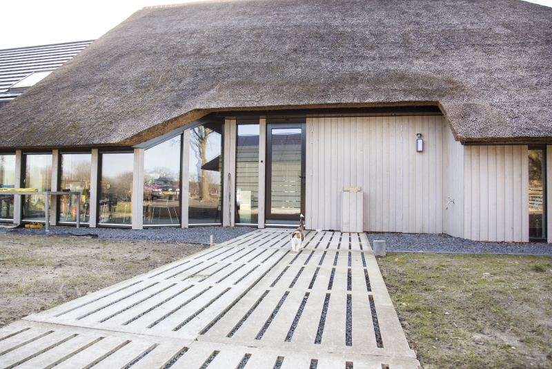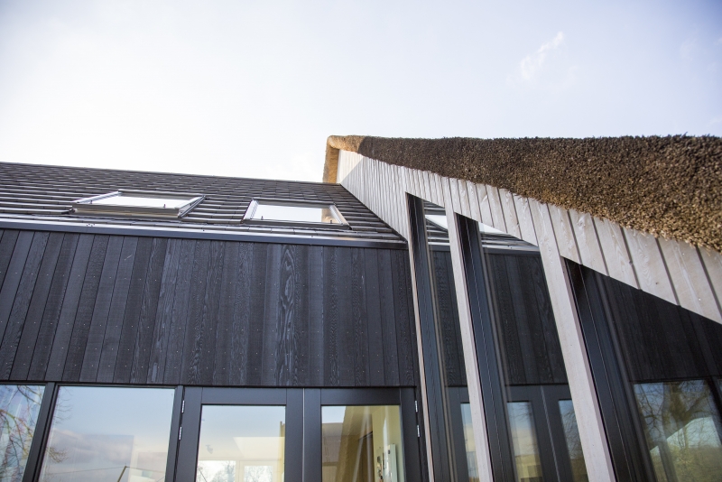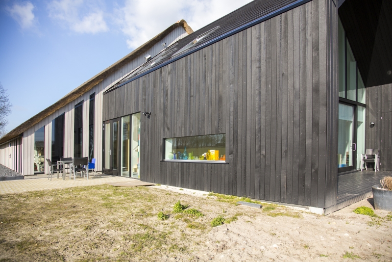 De gevels van het nieuwe woongedeelte zijn bekleed met fijnbezaagd Red Cedar in de kleur zwart. Dit contrasteert prachtig met het riet van de schuur. De grote glasgevel aan de voorzijde biedt een prachtig uitzicht over het glooiende landschap en is overkapt met een fors overstek. Hierdoor blijft het zomers koel, maar kan in de winter toch worden geprofiteerd van binnenvallend zonlicht. Op het dak van het bijgebouw zijn zonnepanelen aangebracht die voor een belangrijk deel in de stroomvoorziening van de woning voorzien.